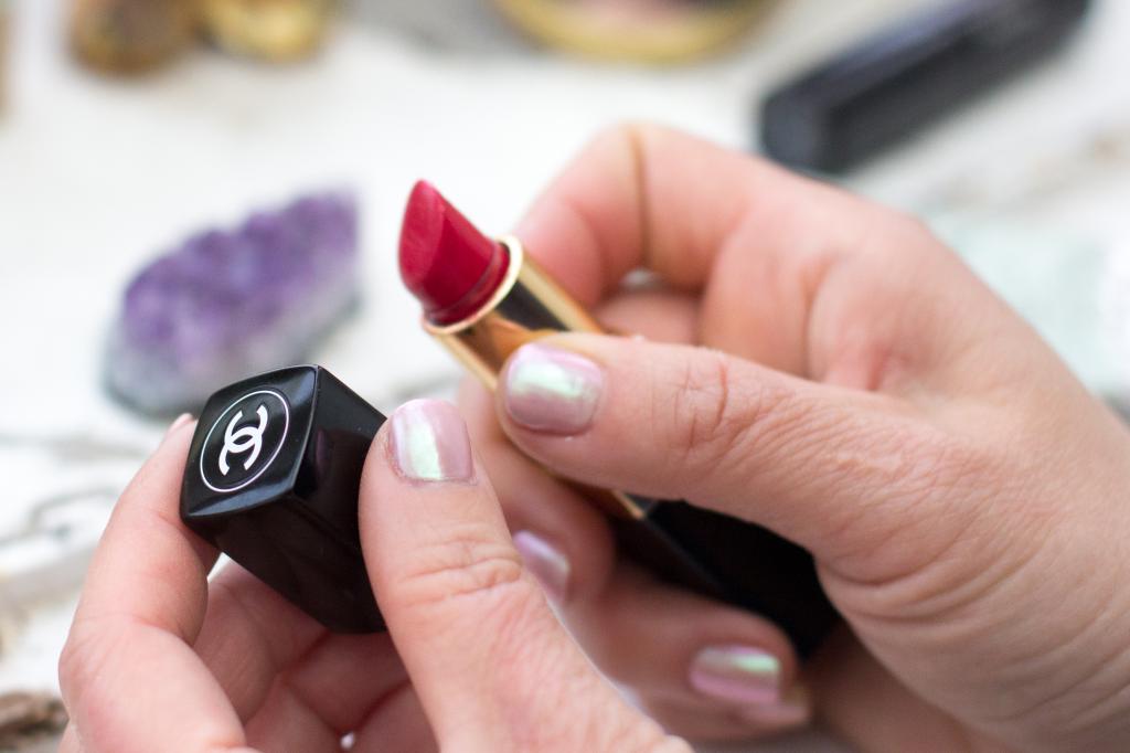 Červená rtěnka a upravené nehty.